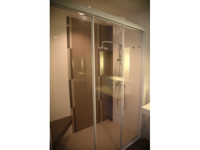 ห้องน้ำ : แยกส่วนเปียกกับส่วนแห้ง ชุดสุขภัณฑ์ อ่างล้างหน้าพร้อมกระจกและตู้เก็บของ กระจกกั้นอาบน้ำ ฝักบัวแบบน้ำตก