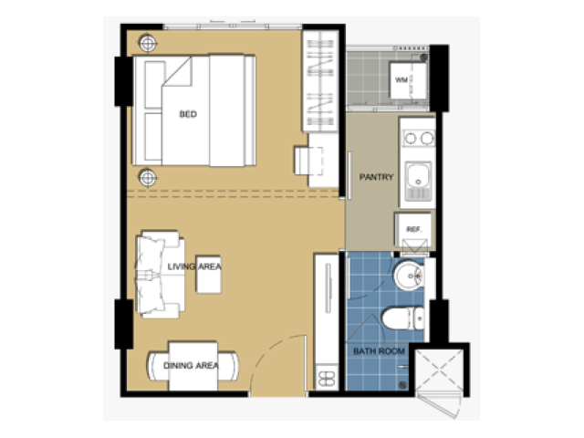 เป็นห้องชุด 1 ห้องนอน 1 ห้องน้ำ ห้องรับแขก - ห้องครัว - ระเบียง