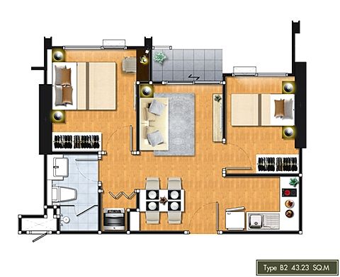 2 bedrooms 43.2 Sq.m, ชั้น23 แบบห้อง B2