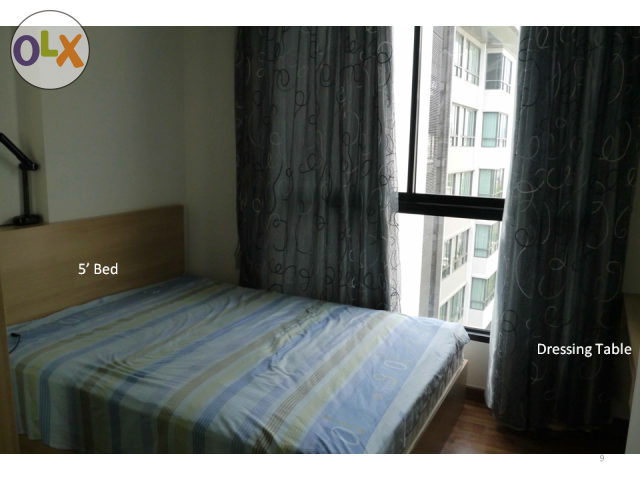 -Fully furnished flat with 5’ bed, 2-door wardrobe, TV-cabinet, sofa, dinning table with 2 chairs, dressing desk, kitchen and clothing rack at balcony.