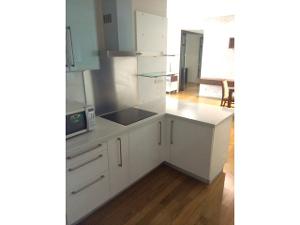 The condo has a large semi open plan fully equipped kitchen which leads out to a large open living area with a large sofa.