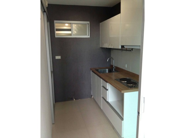 6.ครัว (บิวท์อินน์) พร้อมเตาไฟฟ้าและที่เก็บอุปกรณ์เครื่องครัวแบบลอยตัวติดผนังสีขาว