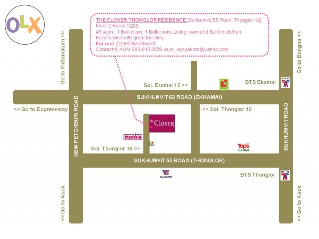 Close to: Starbucks, Foodland supermarket, Tops Market Place Supermarket, Samitivej Hospital, Camillion Hospital, International schools, easy access to Thonglor BTS station, the expressway, Sukhumvit Road, Petchburi Road and Suwannabumi Airport.