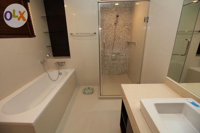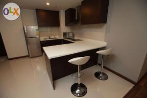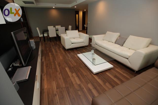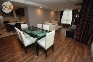 It is 112 sq. m., 2 Bedrooms and 2 Bathrooms, fully furnished with all furniture, a fridge, microwave/grill oven, 42 inch LCD screen and dvd player in the living