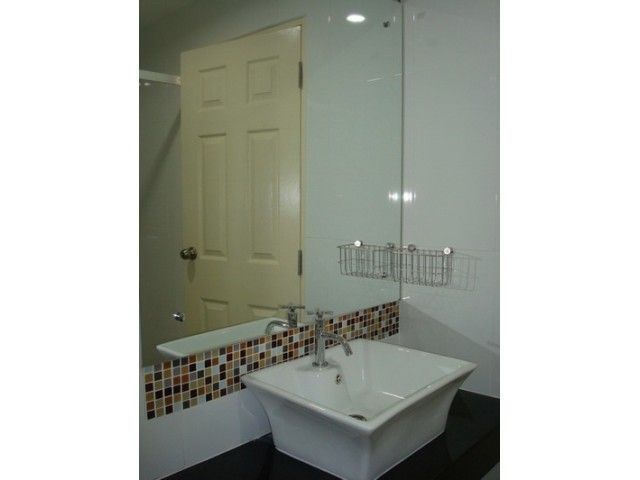 * พื้นห้องปูแกรนิโตแผ่นใหญ่สวยงาม ห้องอาบน้ำแถมกระจกกั้นแยกส่วนเปียกแห้ง+สุขภัณฑ์, ราวแขวนผ้า, ชั้นวางของ