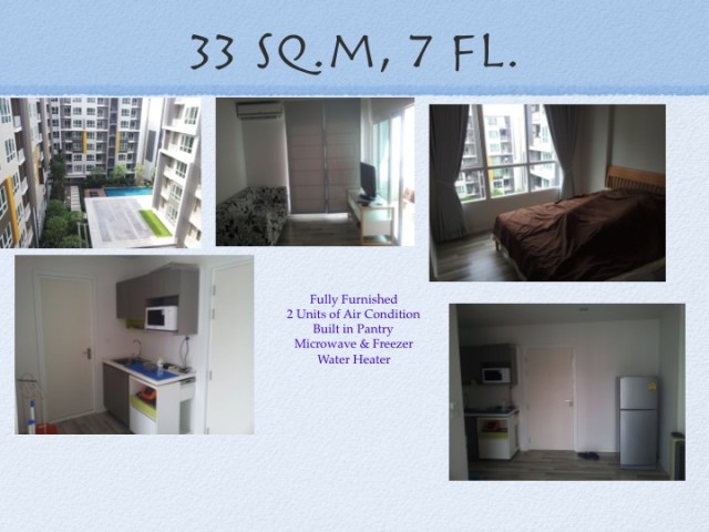 ห้องขนาด 33 ตรม พร้อมแอร์ 2 ยูนิต เตียงนอน ตู้เย็น ไมโครเวฟ Pantry เครื่องทำน้ำอุ่น LCD พร้อมเข้าอยู่ ใกล้เมเจอร์รัชโยธิน รพ. เมโย ม. เกษตร สนใจสอบถามได้